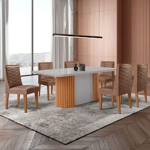 O conjunto combina design moderno, sofisticacao e funcionalidade. A Mesa Aspen se destaca pelo visual imponente, com tampo em MDF e vidro com canto copo, alem da base ripada que confere textura e personalidade ao ambiente. Ideal para quem busca um estilo clean e contemporaneo, ela transforma qualquer espaco com leveza e elegancia.