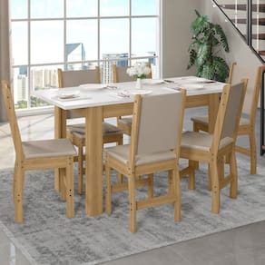 Características: Marca: Poliman móveis Modelo: Bellagio Material do Tampo: MDP Material da Cadeira: MDF/MDP Quantidade de Cadeiras: 6 Quantidade de Pés: 4