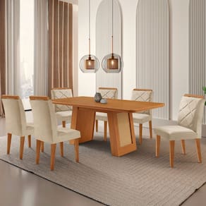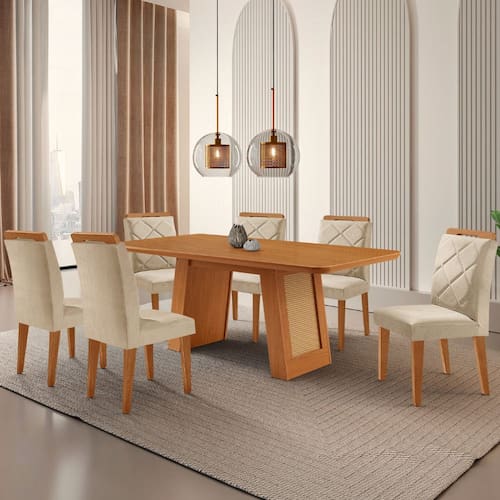 A Mesa Carolina, com tampo laminado de 180 cm, complementa o conjunto com estilo e praticidade. Seu diferencial esta na base com detalhes que imitam rattan, adicionando um toque natural e elegante ao ambiente.
