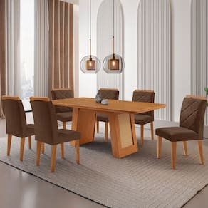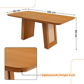 A Mesa Carolina, com tampo laminado de 180 cm, complementa o conjunto com estilo e praticidade. Seu diferencial esta na base com detalhes que imitam rattan, adicionando um toque natural e elegante ao ambiente.