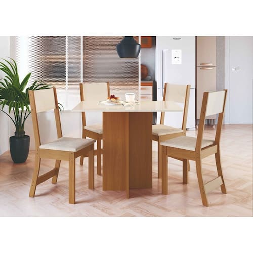 Mesa de Jantar Talita com 4 Cadeiras - Rede Móveis A Rede Móveis vem com essa novidade do Conjunto Mesa de Jantar com 4 Cadeiras Talita possui design funcional e contemporâneo, unindo a sofisticação com o tampo em Offwhite e os pés na cor Freijó tornando a mesa de jantar Talita um móvel conservador e com tons neutros, transmitindo leveza e puro design. A Mesa é fabricada em MDP 15mm com acabamento em Pintura UV e suporta até 40kg distribuídos. Já suas cadeiras possuem estrutura desenvolvida em 100% MDF de 18mm com acabamento em Pintura UV e Estofado em Espuma finalizado em Tecido Linho suportando até 120kg distribuídos.
