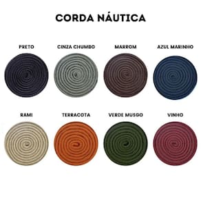 Estrutura da base em Fiberboard com acabamento em Corda Náutica. Tampo de 130 cm em MDF Laqueada com vidro serigrafado fixo, e contra tampo em MDF 18 mm.