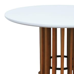 - Materiais: Produzida sua base em madeira maciça envernizada com arco em aço carbono com pintura epóxi, tampo em MDF laqueado ou MDF laminado envernizado com aplicação de vidro