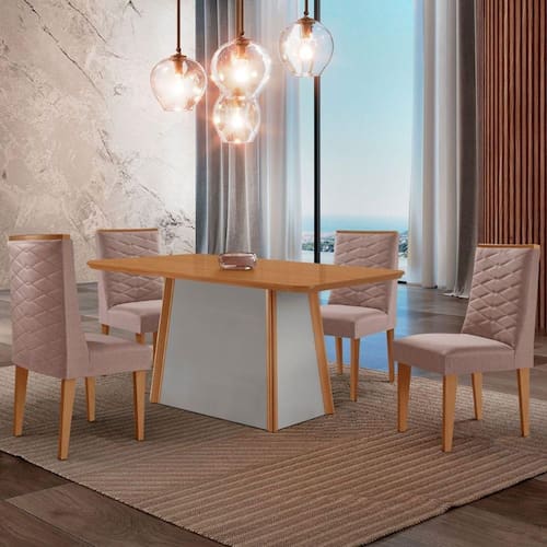 A Mesa Diane, produzida em 100 MDF com tampo canto copo, e a escolha ideal para transformar refeicoes em experiencias memoraveis. Seu design elegante combina perfeitamente estilo e resistencia, garantindo durabilidade sem abrir mao da estetica. A base robusta, com extremidades em acabamento Naturalle, e um verdadeiro destaque visual, agregando charme e sofisticacao ao ambiente. As Cadeiras Safira sao totalmente estofadas, oferecendo conforto e um toque de charme com seus elegantes bordados na parte frontal e traseira. Os detalhes sofisticados valorizam ainda mais seu visual, tornando-a perfeita para ambientes modernos e elegantes. As alcas facilitam o manuseio, tornando o dia a dia mais pratico ao movimentar as cadeiras.