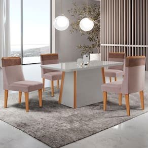 A Mesa Diane, produzida em 100 MDF com tampo canto copo e vidro, e a escolha ideal para transformar refeicoes em experiencias memoraveis. Seu design elegante combina perfeitamente estilo e resistencia, garantindo durabilidade sem abrir mao da estetica. A base robusta, com extremidades em acabamento Naturalle, e um verdadeiro destaque visual, agregando charme e sofisticacao ao ambiente. As Cadeiras Andes sao inspiradas na majestosa Cordilheira dos Andes, trazendo elementos da natureza e da grandiosidade das montanhas em um design unico e imponente. Totalmente estofadas, contam com alca que facilita o manuseio, unindo conforto, praticidade e beleza em uma so peca.