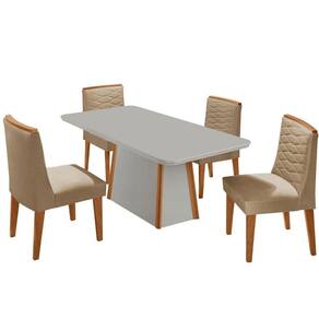 A Mesa Diane, produzida em 100 MDF com tampo Canto Copo e Vidro, e a escolha ideal para transformar refeicoes em experiencias memoraveis. Seu design elegante combina perfeitamente estilo e resistencia, garantindo durabilidade sem abrir mao da estetica. A base robusta, com extremidades em acabamento Naturalle, e um verdadeiro destaque visual, agregando charme e sofisticacao ao ambiente. Para complementar, as Cadeiras Eloise MDF oferecem um toque de conforto. Totalmente estofadas, elas se destacam pelos bordados delicados e acabamentos sofisticados, ideais para compor ambientes modernos e elegantes.