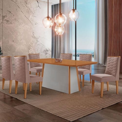 A Mesa Diane, produzida em 100 MDF com tampo canto copo, e a escolha ideal para transformar refeicoes em experiencias memoraveis. Seu design elegante combina perfeitamente estilo e resistencia, garantindo durabilidade sem abrir mao da estetica. A base robusta, com extremidades em acabamento Naturalle, e um verdadeiro destaque visual, agregando charme e sofisticacao ao ambiente. As Cadeiras Safira sao totalmente estofadas, oferecendo conforto e um toque de charme com seus elegantes bordados na parte frontal e traseira. Os detalhes sofisticados valorizam ainda mais seu visual, tornando-a perfeita para ambientes modernos e elegantes. As alcas facilitam o manuseio, tornando o dia a dia mais pratico ao movimentar as cadeiras.