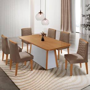 A Mesa Diane, produzida em 100 MDF, e a escolha ideal para transformar refeicoes em experiencias memoraveis. Seu design elegante combina perfeitamente estilo e resistencia, garantindo durabilidade sem abrir mao da estetica. A base robusta, com extremidades em acabamento Naturalle, e um verdadeiro destaque visual, agregando charme e sofisticacao ao ambiente. Para complementar, as Cadeiras Eloise MDF oferecem um toque de conforto. Totalmente estofadas, elas se destacam pelos bordados delicados e acabamentos sofisticados, ideais para compor ambientes modernos e elegantes.
