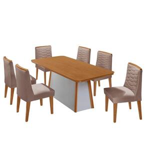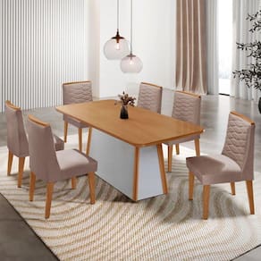 A Mesa Diane, produzida em 100 MDF, e a escolha ideal para transformar refeicoes em experiencias memoraveis. Seu design elegante combina perfeitamente estilo e resistencia, garantindo durabilidade sem abrir mao da estetica. A base robusta, com extremidades em acabamento Naturalle, e um verdadeiro destaque visual, agregando charme e sofisticacao ao ambiente. Para complementar, as Cadeiras Eloise MDF oferecem um toque de conforto. Totalmente estofadas, elas se destacam pelos bordados delicados e acabamentos sofisticados, ideais para compor ambientes modernos e elegantes.