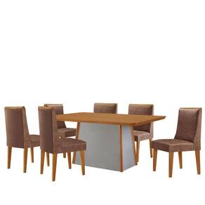 A Mesa Diane, produzida em 100 MDF com Tampo Canto Copo, e a escolha ideal para transformar refeicoes em experiencias memoraveis. Seu design elegante combina perfeitamente estilo e resistencia, garantindo durabilidade sem abrir mao da estetica. A base robusta, com extremidades em acabamento Naturalle, e um verdadeiro destaque visual, agregando charme e sofisticacao ao ambiente. As Cadeiras Lisboa completam o conjunto com conforto e praticidade. Totalmente estofadas, proporcionam uma experiencia agradavel ao sentar, enquanto suas alcas facilitam o manuseio no dia a dia, tornando o ambiente ainda mais funcional.
