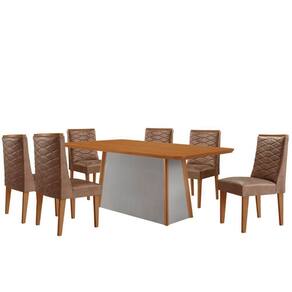 A Mesa Diane, produzida em 100 MDF com tampo canto copo, e a escolha ideal para transformar refeicoes em experiencias memoraveis. Seu design elegante combina perfeitamente estilo e resistencia, garantindo durabilidade sem abrir mao da estetica. A base robusta, com extremidades em acabamento Naturalle, e um verdadeiro destaque visual, agregando charme e sofisticacao ao ambiente. As Cadeiras Safira sao totalmente estofadas, oferecendo conforto e um toque de charme com seus elegantes bordados na parte frontal e traseira. Os detalhes sofisticados valorizam ainda mais seu visual, tornando-a perfeita para ambientes modernos e elegantes. As alcas facilitam o manuseio, tornando o dia a dia mais pratico ao movimentar as cadeiras.