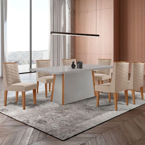Mesa De Jantar Diane 180cm Tampo Mdf Vidro 6 Cadeiras Safira Moderna Veludo Creme Off Naturale Serig Mesa Diane com Cadeira Safira A Mesa Diane, produzida em 100 MDF com tampo canto copo e vidro, e a escolha ideal para transformar refeicoes em experiencias memoraveis. Seu design elegante combina perfeitamente estilo e resistencia, garantindo durabilidade sem abrir mao da estetica. A base robusta, com extremidades em acabamento Naturalle, e um verdadeiro destaque visual, agregando charme e sofisticacao ao ambiente. As Cadeiras Safira sao totalmente estofadas, oferecendo conforto e um toque de charme com seus elegantes bordados na parte frontal e traseira. Os detalhes sofisticados valorizam ainda mais seu visual, tornando-a perfeita para ambientes modernos e elegantes. As alcas facilitam o manuseio, tornando o dia a dia mais pratico ao movimentar as cadeiras. Caracteristicas: Marca: Moderna Mobilia Modelo: Diane / Safira Material: MDF Tampo: Canto Copo com Vidro
