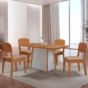 A Mesa Diane, produzida em 100 MDF com tampo canto copo, e a escolha ideal para transformar refeicoes em experiencias memoraveis. Seu design elegante combina perfeitamente estilo e resistencia, garantindo durabilidade sem abrir mao da estetica. A base robusta, com extremidades em acabamento Naturalle, e um verdadeiro destaque visual, agregando charme e sofisticacao ao ambiente. A Cadeira Copper combina design contemporaneo e conforto, com encosto em MDF moldado que oferece suporte ergonomico ideal. Seu estofado acolhedor garante um assento confortavel, enquanto o acabamento refinado e os detalhes sofisticados valorizam seu visual, tornando-a perfeita para ambientes modernos e elegantes.
