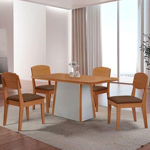 A Mesa Diane, produzida em 100 MDF com tampo canto copo, e a escolha ideal para transformar refeicoes em experiencias memoraveis. Seu design elegante combina perfeitamente estilo e resistencia, garantindo durabilidade sem abrir mao da estetica. A base robusta, com extremidades em acabamento Naturalle, e um verdadeiro destaque visual, agregando charme e sofisticacao ao ambiente. A Cadeira Copper combina design contemporaneo e conforto, com encosto em MDF moldado que oferece suporte ergonomico ideal. Seu estofado acolhedor garante um assento confortavel, enquanto o acabamento refinado e os detalhes sofisticados valorizam seu visual, tornando-a perfeita para ambientes modernos e elegantes.