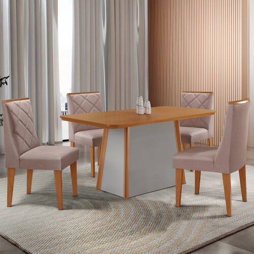 A Mesa Diane, produzida em 100 MDF, e a escolha ideal para transformar refeicoes em experiencias memoraveis. Seu design elegante combina perfeitamente estilo e resistencia, garantindo durabilidade sem abrir mao da estetica. A base robusta, com extremidades em acabamento Naturalle, e um verdadeiro destaque visual, agregando charme e sofisticacao ao ambiente. O modelo perfeito para quem busca um design clean e sofisticado, trazendo leveza ao ambiente. As Cadeiras Isadora sao totalmente estofadas, oferecendo conforto e um toque de charme com seus elegantes bordados.