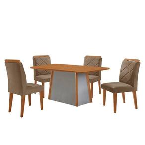 Mesa De Jantar Diane E 4 Cadeiras Melissa Moderna Mobilia Veludo Capuccino/naturalle Laminado A Mesa Diane e uma peca robusta e imponente, projetada para transformar qualquer ambiente. Com tampo em MDF e acabamento canto copo, ela oferece um visual sofisticado e moderno. Sua base se destaca pelos detalhes nas extremidades em acabamento Naturalle, criando um contraste elegante que valoriza ainda mais o design. Ideal para complementar e destacar sua sala de jantar com personalidade.