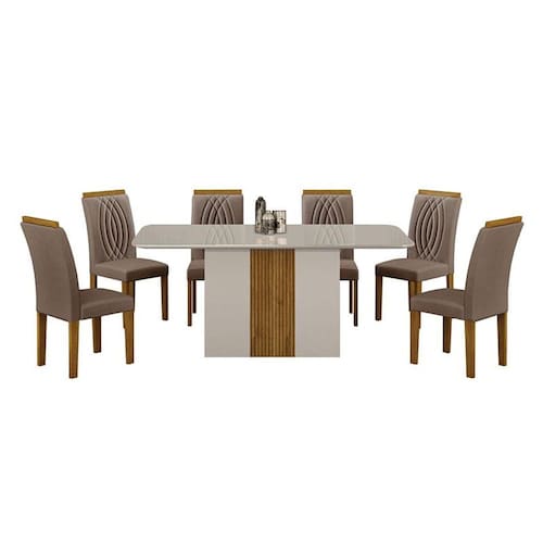 Mesa de Jantar Doha 160x80 Off White Freijó Decor Off com 6 Cadeiras Freijó Joli Camurça – Leifer Móveis