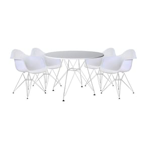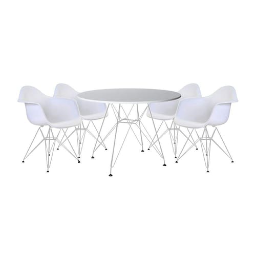 Mesa De Jantar Eames Eiffel Redonda Branca 90cm Com 4 Poltronas Brancas Ferro BrancoO Conjunto de Mesa Eames Eiffel e Poltrona Daw se destaca pelo design moderno e sofisticado. Com base em ferro que confere total resistência, garantindo melhor durabilidade, sendo uma ótima escolha para quem busca conforto e design único.Tipo: ConjuntoModelo: DawCor do Tampo: BrancoCor do Assento: BrancoCARACTERÍSTICASAssento: PolipropilenoTampo: BrancoBase: FerroGarantia: 90 DiasDIMENSÕES DA POLTRONAAltura: 80cmAssento até o chão: 40cmBraço do assento até o chão: 65cmLargura: 38cmComprimento: 38cmSuporta até: 120kgDIMENSÕES DA MESAAltura: 76cmDiâmetro: 90cmRECOMENDAÇÕESLimpeza: Utilize um pano macio levemente úmido.Necessita montagem.ATENÇÃOAS IMAGENS SÃO MERAMENTE ILUSTRATIVAS E PODEM SOFRER VARIAÇÕES DE COR E PEQUENOS DETALHES DE ACORDO COM O SEU MONITOR, ILUMINAÇÃO DO AMBIENTE E ATÉ MESMO A SUA PERCEPÇÃO VISUAL.