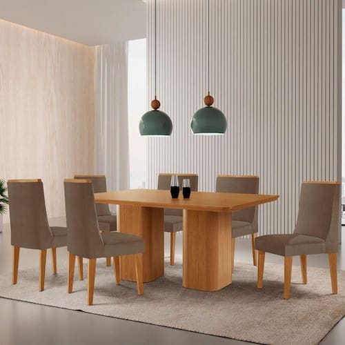 Mesa De Jantar Eloise 180cm Tampo Mdf 6 Cadeiras Lisboa Veludo Capuccino/naturalle A Mesa Eloise e uma peca de design sofisticado, com base em MDF e tampo sem vidro com canto copo, que adiciona elegancia e modernidade ao ambiente. O grande destaque da mesa fica em suas bases, que possuem formato de torres, a Mesa Eloise transforma qualquer espaco com sua presenca marcante e funcionalidade. As cadeiras Lisboa completam o conjunto com conforto e praticidade. Totalmente estofadas, proporcionam uma experiencia agradavel ao sentar, enquanto suas alcas facilitam o manuseio no dia a dia, tornando o ambiente ainda mais funcional. Caracteristicas: Marca: Moderna Mobilia Modelo: Eloise e Lisboa Material: MDF Tampo: Canto Copo sem Vidro