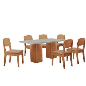 Mesa De Jantar Eloise 180cm Tampo Mdf 6 Cadeiras Moderna Turim 07/nat/off/serig. Off Conjunto Sala de Jantar Mesa Eloise e Cadeira Copper Premium A Mesa Eloise e uma peca de design sofisticado, com tampo em MDF Canto Copo e Vidro, que adiciona elegancia e modernidade ao ambiente. Seu grande destaque esta nas bases com formato de torres, que trazem um visual marcante. A Cadeira Copper Premium combina design contemporaneo e conforto, com encosto em MDF Vidro moldado que proporciona suporte ergonomico ideal. Seu estofado macio garante um assento aconchegante, enquanto o acabamento refinado e os detalhes sofisticados no encosto, que imitam rattan, valorizam seu visual, tornando-a perfeita para ambientes modernos e elegantes.