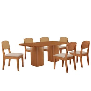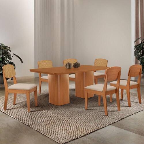 Mesa De Jantar Eloise 180cm Tampo Mdf 6 Cadeiras Moderna Veludo Creme/ Conjunto Sala de Jantar Mesa Eloise e Cadeira Copper A Mesa Eloise e uma peca de design sofisticado, com tampo em MDF Canto Copo, que adiciona elegancia e modernidade ao ambiente. Seu grande destaque esta nas bases com formato de torres, que trazem um visual marcante. A Cadeira Copper Premium combina design contemporaneo e conforto, com encosto em MDF moldado que proporciona suporte ergonomico ideal. Seu estofado macio garante um assento aconchegante, enquanto o acabamento refinado e os detalhes sofisticados no encosto, que imitam rattan, valorizam seu visual, tornando-a perfeita para ambientes modernos e elegantes.