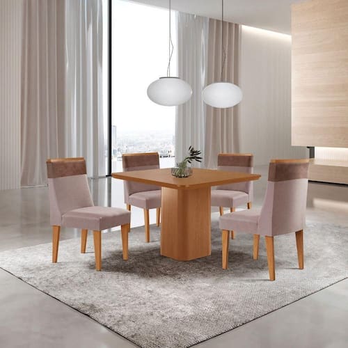 Mesa De Jantar Eloise 90cm Tampo Mdf Laminado 4 Cadeiras Moderna Linho Capuccino Tork Conjunto Mesa Eloise e Cadeira Andes: A Mesa Eloise e uma peca de design sofisticado, com tampo em MDF canto copo, que adiciona elegancia e modernidade ao ambiente. Seu grande destaque esta nas bases com formato de torre, que trazem um visual marcante.