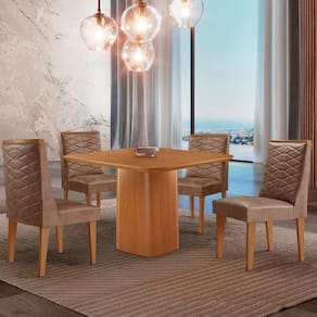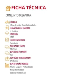 Mesa De Jantar Eloise 90cm Tampo Mdf 4 Cadeiras Moderna Tork/ Conjunto Sala de Jantar Mesa Eloise e Cadeira Safira A Mesa Eloise e uma peca de design sofisticado, com tampo em MDF Canto Copo, que adiciona elegancia e modernidade ao ambiente. Seu grande destaque esta nas bases com formato de torres, que trazem um visual marcante. As Cadeiras Safira sao totalmente estofadas, oferecendo conforto e um toque de charme com seus elegantes bordados na parte frontal e traseira. Os detalhes sofisticados valorizam ainda mais seu visual, tornando-a perfeita para ambientes modernos e elegantes. As alcas facilitam o manuseio, tornando o dia a dia mais pratico ao movimentar as cadeiras.