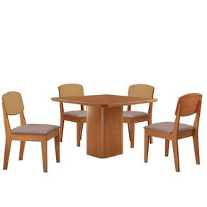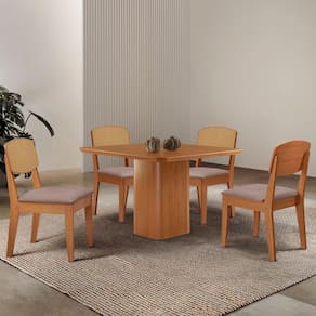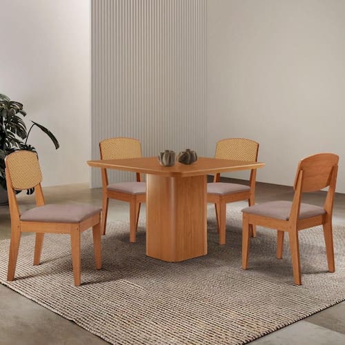 Mesa De Jantar Eloise 90cm Tampo Mdf 4 Cadeiras Moderna Linho Capuccino/ Conjunto Sala de Jantar Mesa Eloise e Cadeira Copper A Mesa Eloise e uma peca de design sofisticado, com tampo em MDF Canto Copo, que adiciona elegancia e modernidade ao ambiente. Seu grande destaque esta nas bases com formato de torres, que trazem um visual marcante. A Cadeira Copper Premium combina design contemporaneo e conforto, com encosto em MDF moldado que proporciona suporte ergonomico ideal. Seu estofado macio garante um assento aconchegante, enquanto o acabamento refinado e os detalhes sofisticados no encosto, que imitam rattan, valorizam seu visual, tornando-a perfeita para ambientes modernos e elegantes.