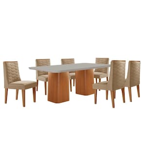 Mesa De Jantar Eloise 180cm Tampo Mdf 6 Cadeiras Moderna Turim 07/nat/off/serig. Off Conjunto Sala de Jantar Mesa Eloise e Cadeira Safira A Mesa Eloise e uma peca de design sofisticado, com tampo em MDF Vidro Canto Copo, que adiciona elegancia e modernidade ao ambiente. Seu grande destaque esta nas bases com formato de torres, que trazem um visual marcante. As Cadeiras Safira sao totalmente estofadas, oferecendo conforto e um toque de charme com seus elegantes bordados na parte frontal e traseira. Os detalhes sofisticados valorizam ainda mais seu visual, tornando-a perfeita para ambientes modernos e elegantes. As alcas facilitam o manuseio, tornando o dia a dia mais pratico ao movimentar as cadeiras.