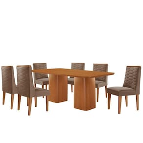 Mesa De Jantar Eloise 180cm Tampo Mdf 6 Cadeiras Moderna Veludo Capuccino/naturalle Conjunto Sala de Jantar Mesa Eloise e Cadeira Safira A Mesa Eloise e uma peca de design sofisticado, com tampo em MDF Canto Copo, que adiciona elegancia e modernidade ao ambiente. Seu grande destaque esta nas bases com formato de torres, que trazem um visual marcante. As Cadeiras Safira sao totalmente estofadas, oferecendo conforto e um toque de charme com seus elegantes bordados na parte frontal e traseira. Os detalhes sofisticados valorizam ainda mais seu visual, tornando-a perfeita para ambientes modernos e elegantes. As alcas facilitam o manuseio, tornando o dia a dia mais pratico ao movimentar as cadeiras.