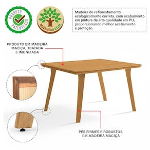 Fabricada em madeira maciça, a mesa garante excelente durabilidade e estabilidade, além de proporcionar um toque acolhedor e natural à decoração. Seu amplo tampo acomoda confortavelmente várias pessoas, tornando-a ideal para refeições em família ou encontros sociais.
