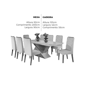 Mesa de Jantar Galak 200x90cm com 8 Cadeiras Iza Viero A Mesa de Jantar Galak 200x90cm com 8 Cadeiras Iza Viero convida a momentos inesquecíveis, transformando refeições em celebrações. Com seu design elegante e dimensões generosas, acomoda confortavelmente a família e amigos, criando um ambiente perfeito para conversas e risadas. A robustez da mesa, aliada à delicadeza das cadeiras, garante durabilidade e um toque de sofisticação ao seu lar. É o centro das atenções, onde memórias são construídas e laços são fortalecidos a cada encontro. As cadeiras Iza, com seu estofamento macio e ergonômico, proporcionam conforto excepcional, permitindo longas horas à mesa sem sacrificar o bem estar. O acabamento impecável de cada peça reflete a qualidade e o cuidado nos detalhes, desde a estrutura sólida até o revestimento suave ao toque. A combinação harmoniosa da madeira com o tecido cria um contraste visual atraente, elevando o nível estético do conjunto. Cada cadeira é um convite ao relaxamento e à boa companhia. A Mesa Galak se destaca pela sua versatilidade, adaptando-se a diversos estilos de decoração, do clássico ao contemporâneo. Suas linhas limpas e acabamento refinado complementam qualquer ambiente, adicionando um toque de modernidade sem perder a elegância atemporal. A superfície ampla oferece espaço de sobra para dispor os pratos, bebidas e decorações, tornando cada refeição um verdadeiro banquete visual. É a peça chave para quem busca funcionalidade e beleza em um só móvel.\nMEDIDAS\nAltura (Mesa) 82 cm\nComprimento (Mesa) 200 cm\nLargura (Mesa) 90 cm\nAltura (Cadeira) 101 cm\nComprimento (Cadeira) 58 cm\nLargura (Cadeira) 42 cm\nCARACTERÍSTICAS\nFabricante Viero\nModelo Mesa de Jantar Galak 200x90cm\nQuantidade de Cadeiras 08\nTipo de produto Mesa de Jantar\nAmbiente Sala de Jantar\nMaterial da Estrutura MDF\nTecido de Revestimento das Cadeiras Tecido Veludo\nPossui Vidro Sim\nEspessura Vidro 4mm\nEnchimento do Assento Espuma D20\nEnchimento do Encosto Espuma D12\nGarantia 3 Meses\nNecessita Montagem Sim\nAcompanha Manual de Instalação Sim\nINFORMAÇÕES IMPORTANTES\nObjetos decorativos que porventura apareçam na foto, não acompanham o produto. Não nos responsabilizamos pela montagem/instalação dos produtos.\nMontagens, desmontagens e instalações são responsabilidades do cliente. Indicamos que contrate uma empresa de montagem ou um montador de sua confiança.\nAlém disso, favor verificar se os pés e acessórios estão dentro do forro inferior do produto. Em suma, todas as informações divulgadas sobre o produto são de responsabilidade do Fabricante.\nAs cores do produto podem variar de acordo com o seu monitor, a iluminação do ambiente em que você está e até mesmo a sua percepção visual. Além da cor, pequenos detalhes e acabamentos podem não ficar evidentes na foto, por isso as imagens são meramente ilustrativas.