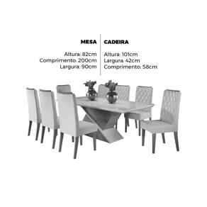 Mesa de Jantar Galak 200x90cm com 8 Cadeiras Iza Viero A Mesa de Jantar Galak 200x90cm com 8 Cadeiras Iza Viero convida a momentos inesquecíveis, transformando refeições em celebrações. Com seu design elegante e dimensões generosas, acomoda confortavelmente a família e amigos, criando um ambiente perfeito para conversas e risadas. A robustez da mesa, aliada à delicadeza das cadeiras, garante durabilidade e um toque de sofisticação ao seu lar. É o centro das atenções, onde memórias são construídas e laços são fortalecidos a cada encontro. As cadeiras Iza, com seu estofamento macio e ergonômico, proporcionam conforto excepcional, permitindo longas horas à mesa sem sacrificar o bem estar. O acabamento impecável de cada peça reflete a qualidade e o cuidado nos detalhes, desde a estrutura sólida até o revestimento suave ao toque. A combinação harmoniosa da madeira com o tecido cria um contraste visual atraente, elevando o nível estético do conjunto. Cada cadeira é um convite ao relaxamento e à boa companhia. A Mesa Galak se destaca pela sua versatilidade, adaptando-se a diversos estilos de decoração, do clássico ao contemporâneo. Suas linhas limpas e acabamento refinado complementam qualquer ambiente, adicionando um toque de modernidade sem perder a elegância atemporal. A superfície ampla oferece espaço de sobra para dispor os pratos, bebidas e decorações, tornando cada refeição um verdadeiro banquete visual. É a peça chave para quem busca funcionalidade e beleza em um só móvel.\nMEDIDAS\nAltura (Mesa) 82 cm\nComprimento (Mesa) 200 cm\nLargura (Mesa) 90 cm\nAltura (Cadeira) 101 cm\nComprimento (Cadeira) 58 cm\nLargura (Cadeira) 42 cm\nCARACTERÍSTICAS\nFabricante Viero\nModelo Mesa de Jantar Galak 200x90cm\nQuantidade de Cadeiras 08\nTipo de produto Mesa de Jantar\nAmbiente Sala de Jantar\nMaterial da Estrutura MDF\nTecido de Revestimento das Cadeiras Tecido Veludo\nPossui Vidro Sim\nEspessura Vidro 4mm\nEnchimento do Assento Espuma D20\nEnchimento do Encosto Espuma D12\nGarantia 3 Meses\nNecessita Montagem Sim\nAcompanha Manual de Instalação Sim\nINFORMAÇÕES IMPORTANTES\nObjetos decorativos que porventura apareçam na foto, não acompanham o produto. Não nos responsabilizamos pela montagem/instalação dos produtos.\nMontagens, desmontagens e instalações são responsabilidades do cliente. Indicamos que contrate uma empresa de montagem ou um montador de sua confiança.\nAlém disso, favor verificar se os pés e acessórios estão dentro do forro inferior do produto. Em suma, todas as informações divulgadas sobre o produto são de responsabilidade do Fabricante.\nAs cores do produto podem variar de acordo com o seu monitor, a iluminação do ambiente em que você está e até mesmo a sua percepção visual. Além da cor, pequenos detalhes e acabamentos podem não ficar evidentes na foto, por isso as imagens são meramente ilustrativas.