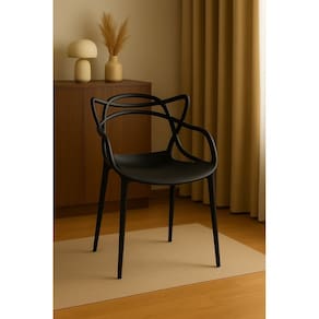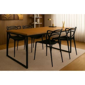 A mesa retangular conta com tampo em MDF padrão Freijó (120x80 cm), que combina o charme da madeira com a modernidade da estrutura metálica preta. Os pés em aço carbono com pintura eletrostática garantem durabilidade e estabilidade. As cadeiras Allegra, em polipropileno de alta qualidade, oferecem um design ergonômico com encosto vazado que proporciona conforto e um toque contemporâneo.