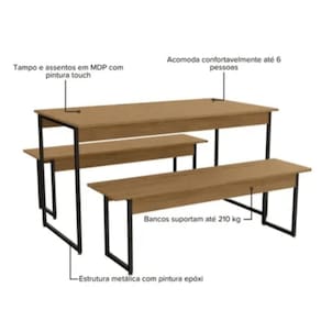 - Dimensões do Produto (LarguraXProfundidadeXAltura): Mesa 136x60x74cm / Banco 130x34,5x43;