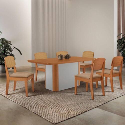 Mesa De Jantar Isadora 180cm Tampo Mdf Laminado Turim 07 Off White Sala de Jantar Isadora com Cadeira Copper Premium A mesa Isadora, com Canto Copo Laminado, garante seguranca e durabilidade, enquanto sua base deslumbrante, com detalhe especial na sua angulacao arredondada Naturalle. A Cadeira Copper Premium combina design contemporaneo e conforto, com encosto em MDF moldado que proporciona suporte ergonomico ideal. Seu estofado macio garante um assento aconchegante, enquanto o acabamento refinado e os detalhes sofisticados no encosto, que imitam rattan, valorizam seu visual, tornando-a perfeita para ambientes modernos e elegantes.