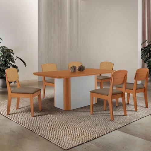 Mesa De Jantar Isadora 180cm Tampo Mdf Laminado Veludo Capuccino Off White Sala de Jantar Isadora com Cadeira Copper Premium A mesa Isadora, com Canto Copo Laminado, garante seguranca e durabilidade, enquanto sua base deslumbrante, com detalhe especial na sua angulacao arredondada Naturalle. A Cadeira Copper Premium combina design contemporaneo e conforto, com encosto em MDF moldado que proporciona suporte ergonomico ideal. Seu estofado macio garante um assento aconchegante, enquanto o acabamento refinado e os detalhes sofisticados no encosto, que imitam rattan, valorizam seu visual, tornando-a perfeita para ambientes modernos e elegantes.