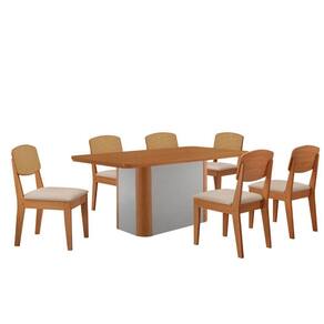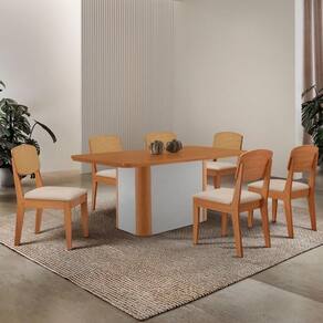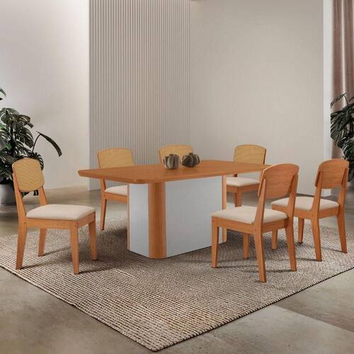 Mesa De Jantar Isadora 180cm Tampo Mdf Laminado Veludo Creme Off White Sala de Jantar Isadora com Cadeira Copper Premium A mesa Isadora, com Canto Copo Laminado, garante seguranca e durabilidade, enquanto sua base deslumbrante, com detalhe especial na sua angulacao arredondada Naturalle. A Cadeira Copper Premium combina design contemporaneo e conforto, com encosto em MDF moldado que proporciona suporte ergonomico ideal. Seu estofado macio garante um assento aconchegante, enquanto o acabamento refinado e os detalhes sofisticados no encosto, que imitam rattan, valorizam seu visual, tornando-a perfeita para ambientes modernos e elegantes.