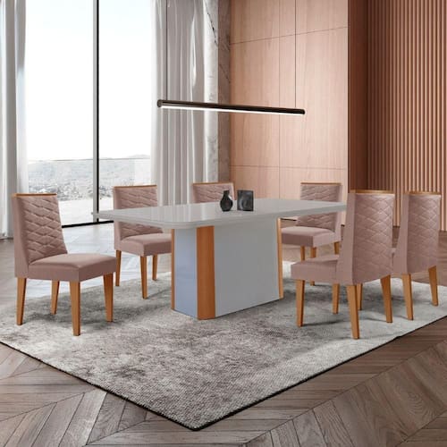 A mesa Isadora, com tampo Canto Copo e Vidro, garante seguranca e durabilidade, enquanto sua base deslumbrante, com detalhe especial na sua angulacao arredondada Naturalle, transforma este conjunto em uma verdadeira peca de destaque na sua sala de jantar!