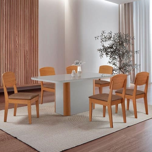 Mesa De Jantar Isadora 180cm Tampo Mdf Vidro Com 6 Cadeiras Tork Serig Off