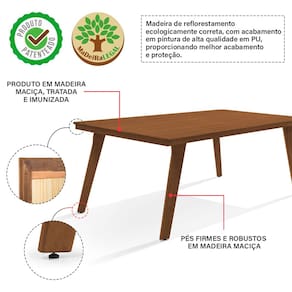 Fabricada em madeira maciça, a mesa garante excelente durabilidade e estabilidade, além de proporcionar um toque acolhedor e natural à decoração. Seu amplo tampo acomoda confortavelmente várias pessoas, tornando-a ideal para refeições em família ou encontros sociais.