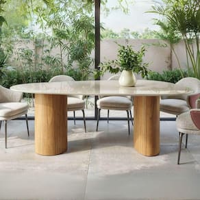 A Mesa de Jantar Breeze, com um design orgânico, possui tampo de MDF com lâmina natural de madeira e concebida para agregar elegância e funcionalidade à sua sala de jantar.