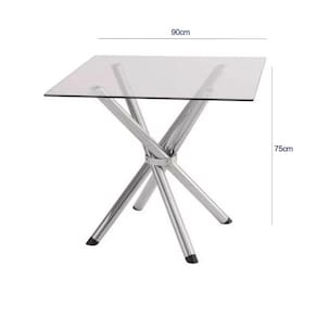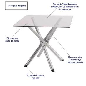 Acompanhando a mesa, está o tampo de vidro incolor quadrado de 90x90cm e 6mm de espessura. O vidro é enviado super bem embalado em uma caixa de madeira, para garantir que chegue em perfeito estado de conservação. Com capacidade para 4 lugares, a mesa redonda cromada é ideal para reunir amigos e familiares em momentos especiais.