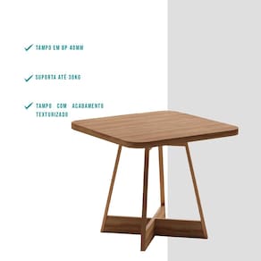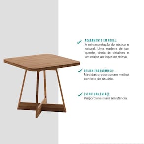 A Mesa de Jantar Átria Quadrada para 4 lugares, com dimensões ótimas para ambientes menores. Produto versátil e de fácil combinação com diversos estilos de cadeiras. Com linhas retas transmitindo modernidade, ela se encaixa facilmente em ambientes de personalidade trazendo a sensação de aconchego para o ambiente com a junção de acabamento em amadeirado e complementos em tubo de aço redondo.