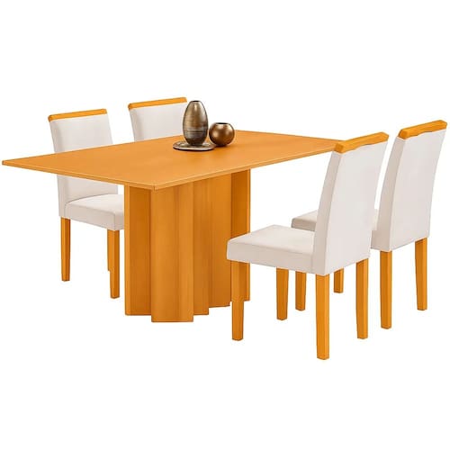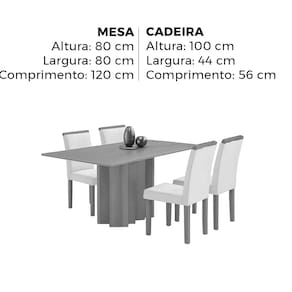Mesa de Jantar Recife com 4 Cadeiras Viero A Mesa de Jantar Recife com 4 Cadeiras Viero combina elegância e praticidade para transformar sua sala de jantar em um espaço convidativo e moderno. Com design contemporâneo, a mesa possui estrutura resistente e acabamento sofisticado, enquanto as cadeiras oferecem conforto e estilo com assentos estofados e encosto ergonômico. Ideal para ambientes compactos ou medianos, é a escolha perfeita para quem valoriza beleza e funcionalidade no dia a dia. Seu visual clean se adapta facilmente a diferentes estilos de decoração, do minimalista ao mais clássico. A estrutura em madeira garante durabilidade e resistência por muitos anos de uso. Perfeita para refeições em família, jantares especiais ou para complementar a decoração do seu lar com bom gosto.\nMEDIDAS\nAltura (Mesa) 80 cm\nComprimento (Mesa) 120 cm\nLargura (Mesa) 80 cm\nAltura (Cadeira) 100 cm\nComprimento (Cadeira) 56 cm\nLargura (Cadeira) 44 cm\nCARACTERÍSTICAS\nFabricante Viero\nModelo Mesa de Jantar Recife com 4 Cadeiras\nAmbiente Sala de Jantar\nEstrutura MDP / MDF\nPreenchimento Assento Espuma D16\nPossui Vidro Não\nRevestimento Tecido Veludo\nNecessita Montagem Sim\nAcompanha Manual de Instalação Sim\nINFORMAÇÕES IMPORTANTES\nObjetos decorativos que porventura apareçam na foto, não acompanham o produto. Não nos responsabilizamos pela montagem/instalação dos produtos.\nMontagens, desmontagens e instalações são responsabilidades do cliente. Indicamos que contrate uma empresa de montagem ou um montador de sua confiança.\nAlém disso, favor verificar se os pés e acessórios estão dentro do forro inferior do produto. Em suma, todas as informações divulgadas sobre o produto são de responsabilidade do Fabricante.\nAs cores do produto podem variar de acordo com o seu monitor, a iluminação do ambiente em que você está e até mesmo a sua percepção visual. Além da cor, pequenos detalhes e acabamentos podem não ficar evidentes na foto, por isso as imagens são meramente ilustrativas.