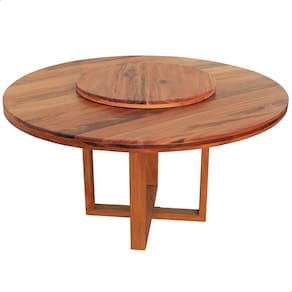 Mesa de jantar redonda 120 cm de diâmetro, com prato giratório de 80 cm, fabricada em madeira maciça de lei com acabamento natural envernizado, garantindo resistência, durabilidade e requinte para seu ambiente. Ideal para reunir família e amigos com praticidade e estilo. Altura 80 cm, peso 90 kg. Montagem simples dos pés.
