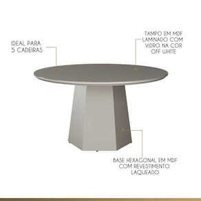 CARACTERÍSTICAS TÉCNICAS: - Base Hexagonal Produzida em MDF com Revestimento Laqueado - Tampo Produzido em MDF Laminado com Vidro 4mm na Cor Off White - Produto Entregue Semi Montado *Ideal para 5 Cadeiras