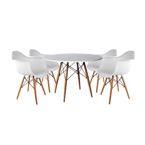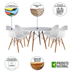 Mesa De Jantar Redonda Eiffel Eames Em Madeira 90cm Branca Com 4 Poltronas BrancasO Conjunto de Mesa Eames Eiffel e Poltrona Daw se destaca pelo design moderno e sofisticado. Com base em madeira maciça que confere total resistência, garantindo melhor durabilidade, sendo uma ótima escolha para quem busca conforto e design único.Tipo: ConjuntoModelo: DawCor do Tampo: BrancoCor do Assento: BrancoCARACTERÍSTICASAssento: PolipropilenoTampo: BrancoBase: Madeira MaciçaGarantia: 90 DiasDIMENSÕES DA POLTRONAAltura: 80cmAssento até o chão: 40cmBraço do assento até o chão: 65cmLargura: 38cmComprimento: 38cmSuporta até: 120kgDIMENSÕES DA MESAAltura: 76cmDiâmetro: 90cmRECOMENDAÇÕESLimpeza: Utilize um pano macio levemente úmido.Necessita montagem.ATENÇÃOAS IMAGENS SÃO MERAMENTE ILUSTRATIVAS E PODEM SOFRER VARIAÇÕES DE COR E PEQUENOS DETALHES DE ACORDO COM O SEU MONITOR, ILUMINAÇÃO DO AMBIENTE E ATÉ MESMO A SUA PERCEPÇÃO VISUAL.