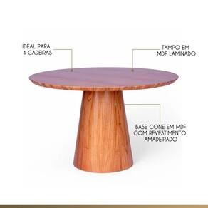 A Mesa de Jantar Redonda Liz é um móvel versátil que vai deixar o seu ambiente cheio de estilo e personalidade. Possui um design atual que pode ser utilizado em diversas composições e decorações. Pela sua versatilidade consegue ser utilizada em diferentes ambientes como sala de jantar, copa, cozinha, espaço gourmet ou onde você precisar. A estrutura da Mesa de Jantar Liz é produzida com materiais de excelente qualidade que garantem durabilidade e beleza ao seu ambiente. CARACTERÍSTICAS TÉCNICAS: - Base Cone Produzida em MDF com Revestimento Amadeirado - Tampo Produzido em MDF Laminado - Produto Entregue Semi Montado *Ideal para 4 Cadeiras *Cadeiras NÃO Inclusas INFORMAÇÕES TÉCNICAS: Altura: 78 cm Largura: 120 cm Profundidade: 120 cm Peso: 50 kg INFORMAÇÕES ADICIONAIS: - Conferir se o produto está de acordo com o que comprou, produto danificado não será aceito troca. - As imagens ambientadas são meramente ilustrativas e podem apresentar itens que não compõe o produto. As cores do produto podem variar de acordo com o monitor, a iluminação do ambiente ou sua percepção visual. - Limpeza deve ser feita com pano macio e seco ou levemente umedecido com água e sabão neutro. Não devem ser utilizados abrasivos como palha de aço e objetos cortantes; Garantia para defeitos de fabricação conforme Código de Defesa do Consumidor. Marca: Não Informado
