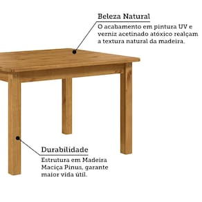 Estilo: Clássico Atóxico: Sim Formato: Retangular Peso (kg): 8 Dobrável: Não Garantia: 03 Meses Altura (cm): 78.5 Descrição: Mesa de jantar confeccionada em madeira pinus, com acabamento rústico pintura PU materiais que garantem maior resistência e segurança ao produto, é ideal para cozinhas ou salas de jantar. Produto para ambiente interno. Acabamento: Pintura UV Extensível: Não Largura (cm): 120 Possui Vidro: Não Possui Portas: Não Design da Base: 4 Pés Possui Rodízio: Não Suporta Até (kg): 120 Profundidade (cm): 90 Escala de Brilho: Semi-Brilho Material da Base: Madeira Maciça Material do Tampo: Madeira Maciça Origem do Produto: Nacional Acabamento da Base: Pintura UV Ambiente Principal: Sala de Jantar Espessura do Tampo (mm): 25 Material Principal: Madeira Maciça Necessita Montagem: Sim Possui Prateleiras: Não Acabamento do Tampo: Pintura UV Quantidade de Lugares: 04 Tipo de Madeira Maciça: Pinus Complexidade da Montagem: Baixa: pode ser montado por uma pessoa sozinha Possui Suporte Giratório: Não Informações Complementares (Novo): Possui tampo e cantos arredondados. Acabamento da Pintura UV com Verniz Acetinado Atóxico. Pés chanfrados.